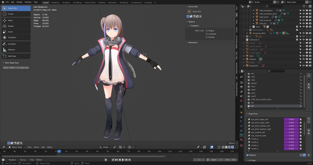 • Face shape key expressions via bones, including eye sparkles, blush, multiple mouth poses and blinks